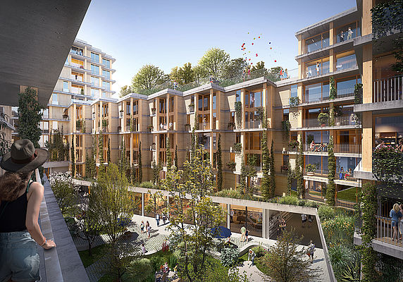 Die Hybridbauweise mit einem massivem Gebäudesockel und darauf aufgesetzten, im Modulraster angeordneten „leichten“ Wohngeschossen erlaubt einen hohen Grad der Vorfertigung, optimale Wirtschaftlichkeit und langfristige Flexibilität, weil Grundrisse über den gesamten Lebenszyklus des Gebäudes adaptiert werden können. Vielfältige Maßnahmen zur klimatischen Anpassung der Gebäude, wie etwa begrünte Fassaden, wirken sich zudem positiv auf das Mikroklima der Wohnungen aus.