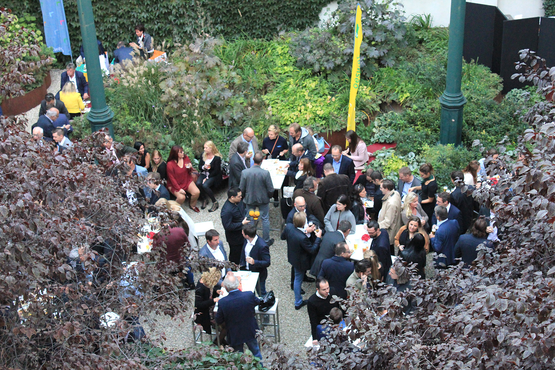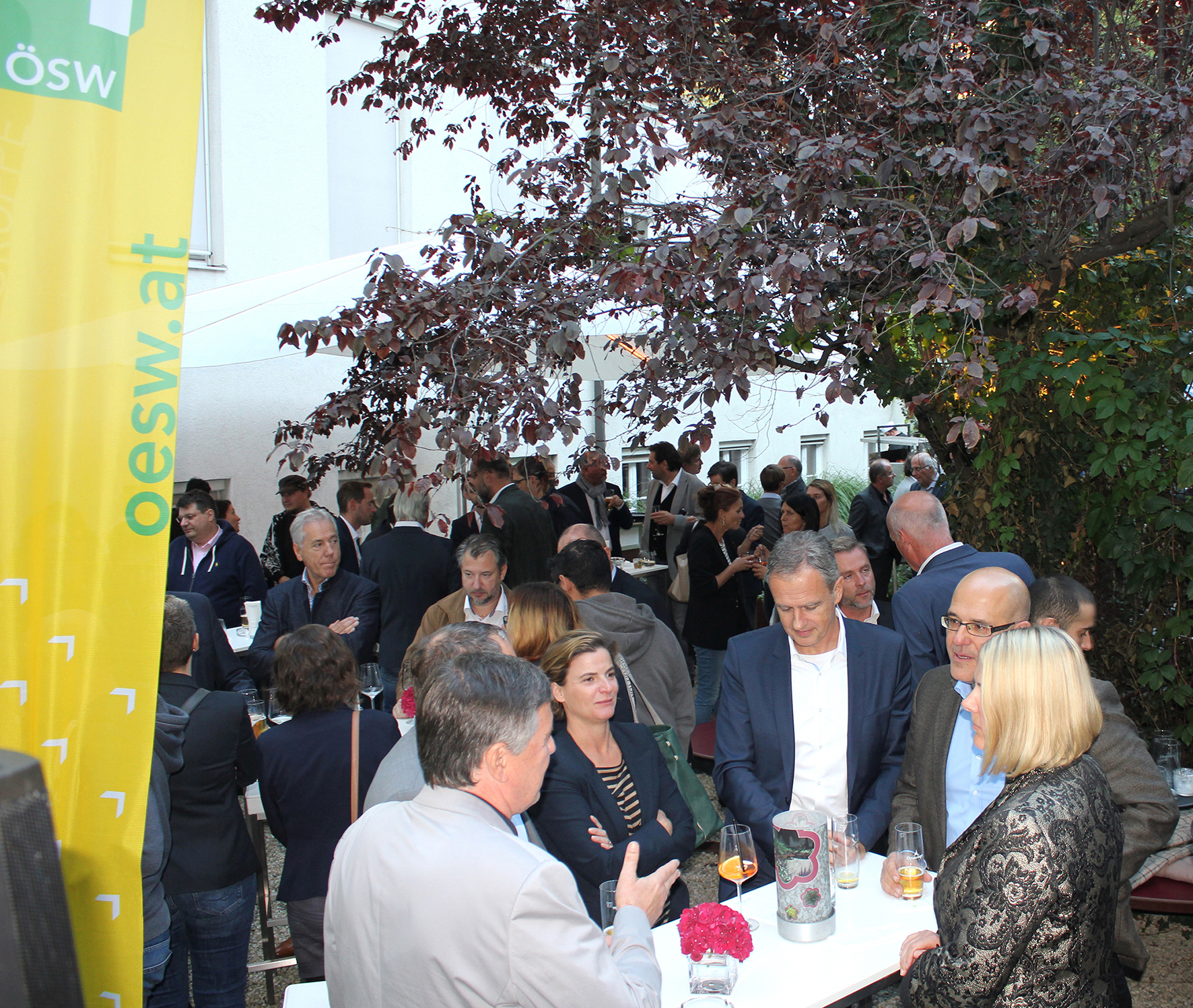 Das Hoffest des Österreichischen Siedlungswerkes am Donnerstag, 27. September 2018, war auch heuer wieder eine rundum gelungene Veranstaltung. Als mittlerweile traditionelles Highlight am Ende des Sommers laden die Vorstände Michael Pech und Wolfgang Wahlmüller jedes Jahr Gäste aus Bauwirtschaft, Architektur, Finanzwesen und Politik in das schöne Ambiente des grünen Innenhofs des Firmensitzes in Wien Josefstadt ein.