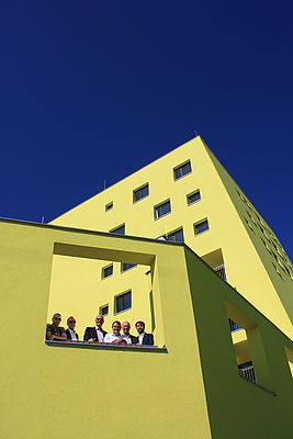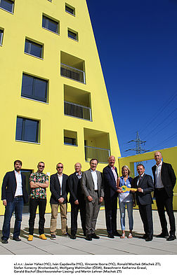 Bei der feierlichen Übergabe waren neben dem ÖSW-Vorstand Wolfgang Wahlmüller und dem Krottenbach-Obmann Stefan Konecny sowohl die Architekten der YIC-architects und Mischek ZT als auch der Bezirksvorsteher des 23. Bezirks, Gerald Bischof, vor Ort.