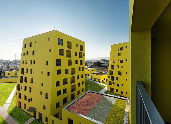 Das Projekt besteht aus 27 supergeförderten und 88 geförderten Wohneinheiten - teilweise mit Eigentumsoption. Hauptsächlich wurden die 55 - 105 m2 großen Wohnungen in vier mehrgeschossigen Wohntürmen umgesetzt. Ein Teil der Wohneinheiten befindet sich in zweigeschossigen Bauteilen, die großteils als Maisonette angelegt sind. Durch die Orientierung nach innen entstehen Patios, die privaten Freiraum bieten. Individuelle Freibereiche wie Loggien und Gärten erweitern den Wohnraum ins Freie. Neben einem Kinderwagenabstellraum und einer eingeschossigen Tiefgarage, stehen den BewohnerInnen auch eine praktische Waschküche, ein Kinderspielraum und 300 Fahrradabstellplätze - davon 30 überdacht - zur Verfügung.