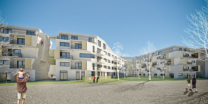 Neben der Sportlandschaft am Dach stellen eine Spiel- und Liegewiese sowie ein Kinder- und Jugendspielbereich mit Wasserspiel grüne Inseln in der Wohnanlage dar. Ebenso ist ein Kleinkinderspielbereich geplant. Die allgemeinen Freiräume im rückwärtigen Bereich sind als Streuobstwiesen gestaltet und dienen eher der ruhigen Entspannung. Da ausgeprägte soziale Beziehungsgeflechte im Wohnquartier ein wesentliches Element von Wohnqualität darstellen, sollen im Rahmen der Projektbegleitung bis zur Übergabe regelmäßige Treffen stattfinden. Diese werden durch den Bauträger unter Hinzuziehung von Architekten, Landschaftsplanern, etc. moderiert. Dadurch soll der Aufbau nachbarschaftlicher Kommunikation, das Gemeinschaftsgefühl und die Identifikation mit dem Wohngebiet gefördert werden. Die ÖSW AG steht an der Spitze der ÖSW-Firmengruppe, die 25 Unternehmen umfasst und ca. 50.000 Einheiten verwaltet. Damit ist der Konzern der größte private gemeinnützige Bauträger in Österreich. Neben dem Wiener Markt ist das Österreichische Siedlungswerk schwerpunktmäßig in den Bundesländern Niederösterreich, Salzburg und Kärnten tätig.